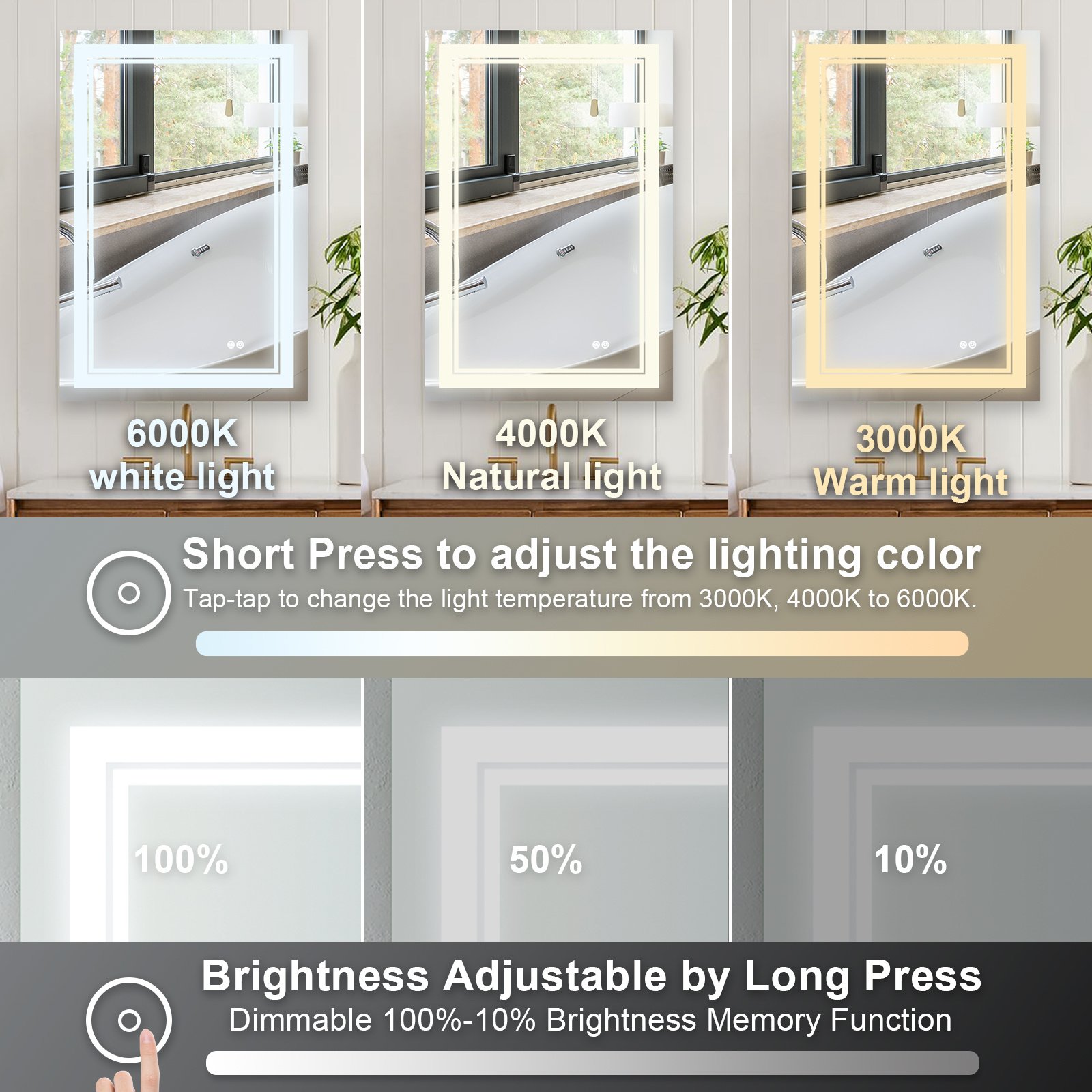 The bathroom mirror with LED light; Made of high qualit Anodized aluminum can be used for long time. High tech Intelligent bathroom vanity makeup mirror with defogging function. Touch sensor button can adjustable mirror color brightness from 2700K-6300K to meet the needs of different light. Brightness can be adjusted freely from 10 % to 100%. Large size bathroom mirrors wall mounted design; it is space-saving. Bright mirror can make your bathroom or living room can be more spacious; Better mood. Perfect for bathroom; bedroom; dressroom; powder room and more.